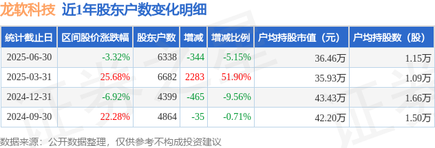 从股价来看,2025年3月31日至2025年6月30日,龙软科技区间跌幅为3.32%,在此期间股东户数减少344.0户,减幅为5.15%。